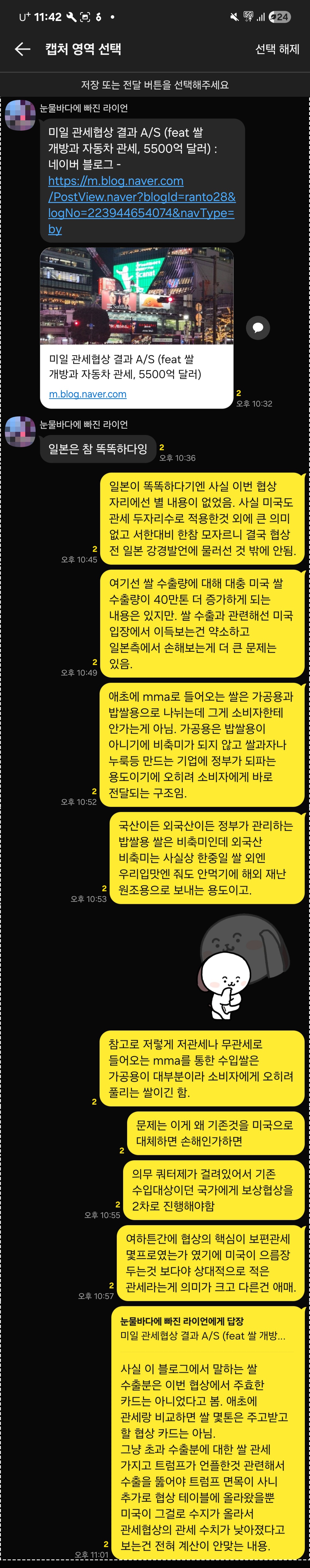 (아래 글은 결과가 나오기 전에 적은 것이지만, 내 예상보다는 협상 결과가 특별히 좋지는 않다. 추가 관세로 협상된 일본보다야 우위이지만 15% 고정인 유럽과 비교할 때 특별히 우위가 없기 때문이다. 수출 비중이 높고 단일 국가로서 협상력이 한계가 있다는 점을 생각하면 이 정도 결과에도 만족할만 하지만, 그럼에도 협상 결과가 내 기대치에는 미치지 못해 아쉽다.)--------------- 얼마전 미국과 일본의 관세협상 결과를 보고 협상 전의 일본의 맞관세 강경 발언이 유효했고 미국이 물러섰다는 얘기를 나누었다. 이와 관련해서 트럼프의 체면치례를 위해 트럼프가 언론 플레이를 한 쌀 초과 수입에 대한 협상에서 일본이 MMA 쌀 수입에 관해 어느정도 물러선 것을 제외하고 대미 투자규모 등을 포함해 기존에 거..